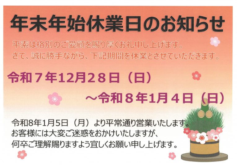 12月28日(日)~1月4日(日)は年末年始休業となります。